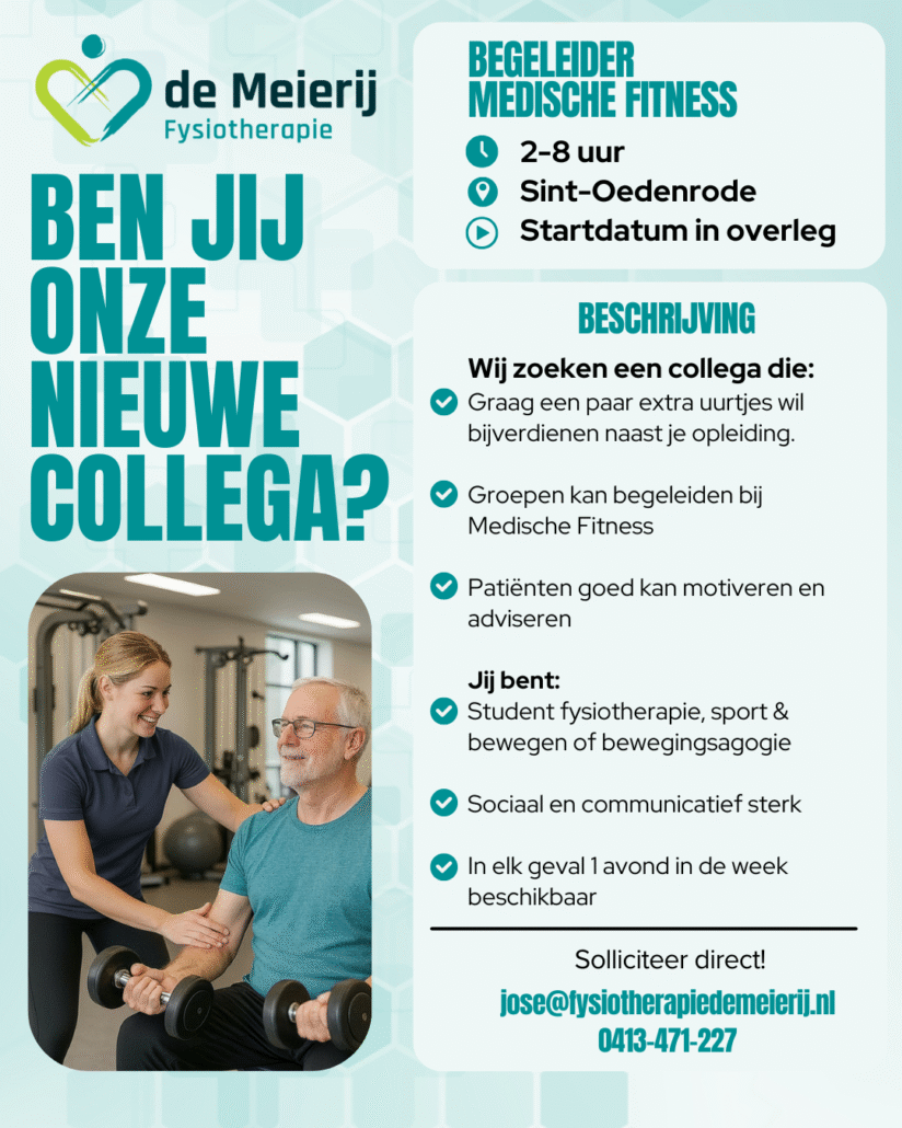 Voor begeleiding van patiënten in de oefenzaal en Medische Fitness, zoeken wij een trainer voor 4 à 8 uur (bijbaan).