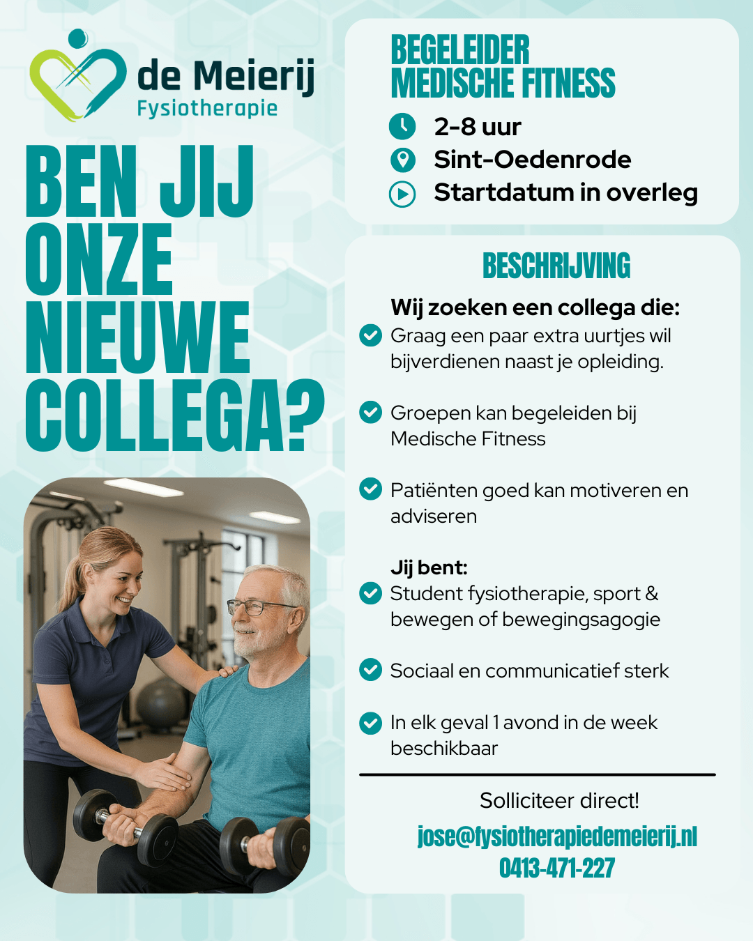 Je kan je sollicitatie met CV en motivatiebrief sturen naar José Kuipers; jose@fysiotherapiedemeierij.nl